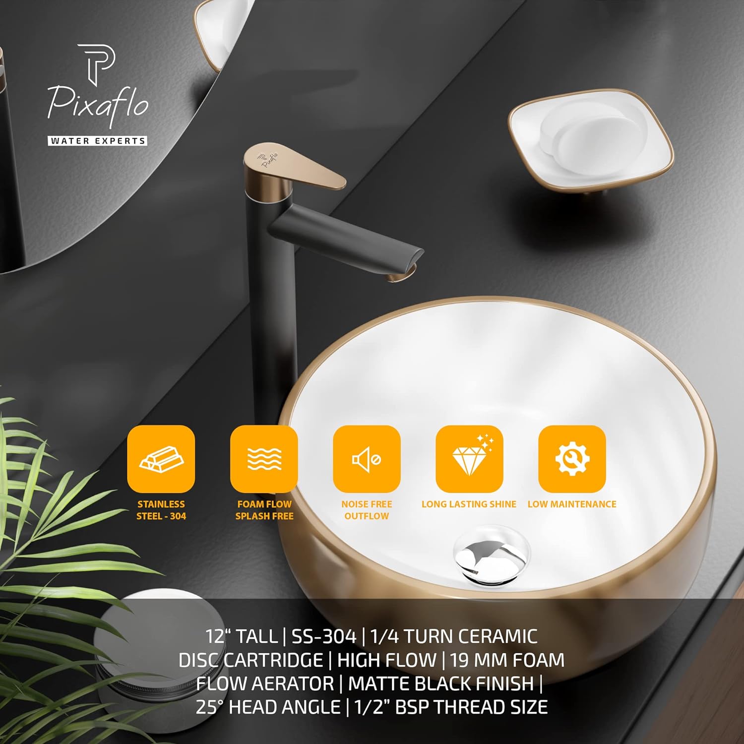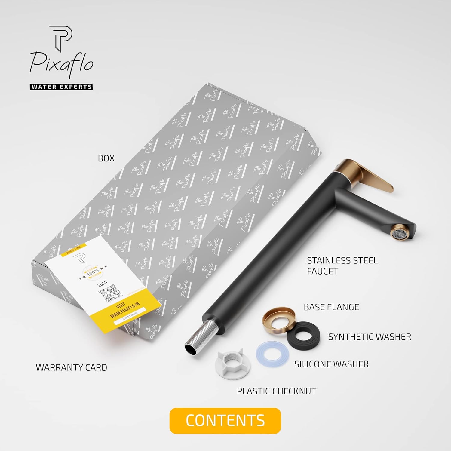 Pixaflo Vocal SS-304 Extended Tall Body Pillar Cock 12" Tap for Wash Basin | Stainless Steel (Black Bronze | Pack of 1)